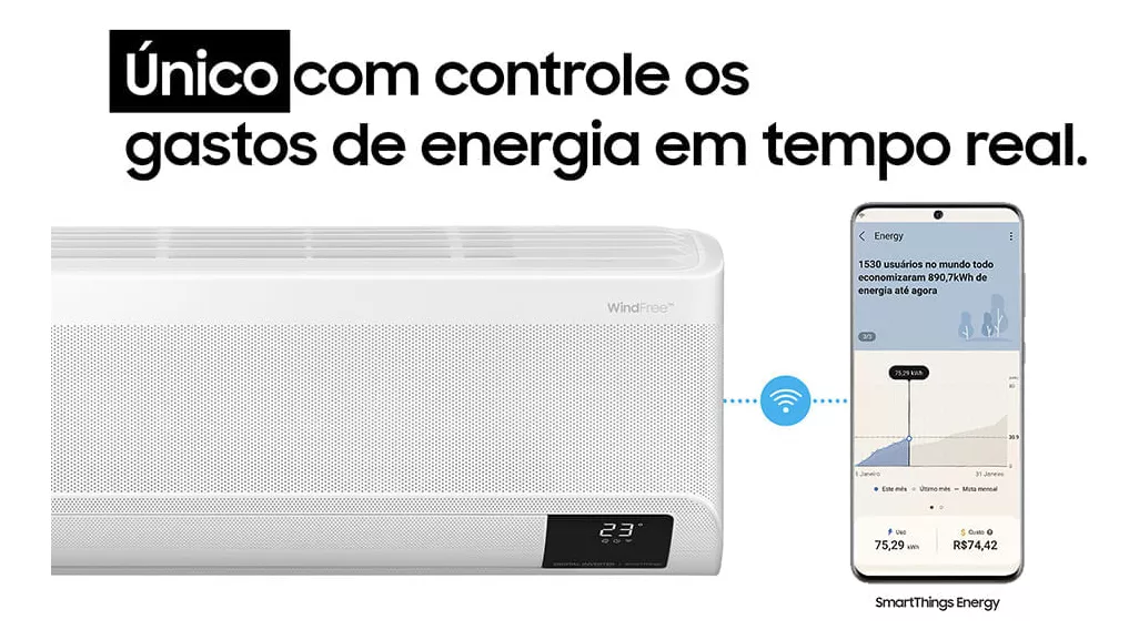 Controle de Gastos em Tempo Real – Compatível com SmartThings Energy Através do aplicativo SmartThings Energy, é possível controlar e monitorar o consumo de energia do ar condicionado WindFree de qualquer lugar, proporcionando maior controle e economia.
