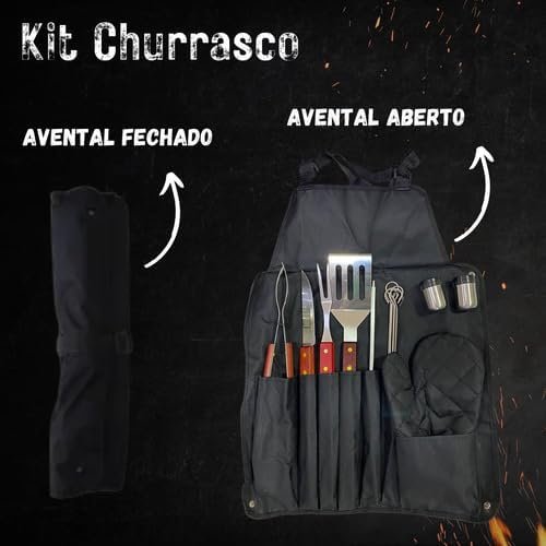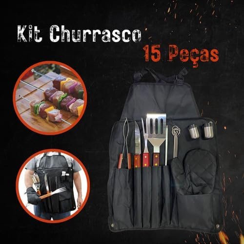 Kit Churrasco com avental 15 Peças Inox Churrasqueiro Kit Churrasco com avental 15 Peças Inox Churrasqueiro
